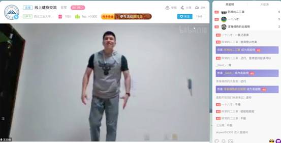 王志峰老师通过讲述自己在健身路上的经历与收获,介绍居家锻炼的方法以及如何制定运动计划,与同学们拉进了距离。随后王志峰老师带领大家一起开展健身挑战,俯卧撑、卷腹、深蹲、靠墙静蹲、波比跳、开合跳…他一边展示动作的正确姿势,一边认真讲解注意事项,并过留言板和弹幕与大家互动,提升了线上活动的参与感。最后王志峰老师解答了同学们平常锻炼的疑惑,介绍了部分锻炼器材使用方法和注意事项。