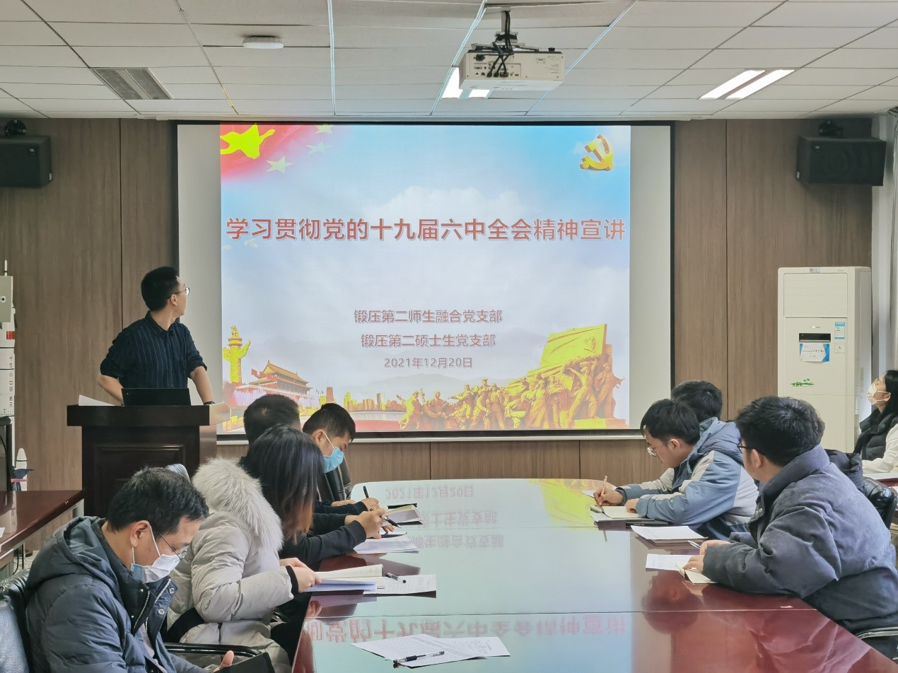 为深入学习贯彻十九届六中全会精神,贯彻一流研究生培养,以党建促科研,提高支部战斗堡垒作用,12月20日上午,锻压第二师生融合党支部联合锻压第二研究生党支部在公字楼322会议室共同开展主题党日活动,会议由锻压第二师生融合党支部书记郑泽邦同志主持,全体党员参会。