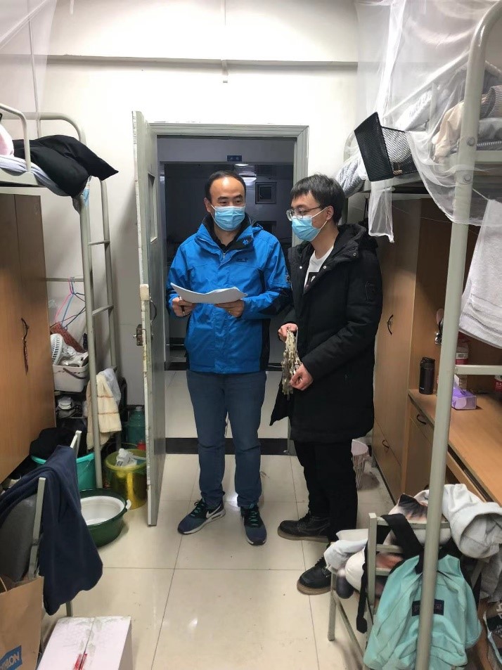 在检查过程中,刘建喜及宿舍管理委员会干事对每个寝室的安全卫生、通风情况以及用电安全进行了仔细检查,也对学生的住宿日常生活进行了解。此阶段是2019级硕士完成毕业论文的重要阶段,刘建喜提醒大家在完成学业之余适当缓解压力,保持寝室卫生干净整洁。