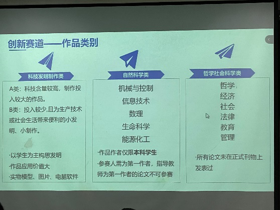 学习经验分享结束后,夏春雨老师在线上就创新创业重要赛事及参赛要求进行了详细讲解。通过对各项赛事进行分类,逐个讲解参赛要求、参赛评选流程,注意事项等重要信息,在场的每一位同学都受益匪浅,能够更好地规划竞赛生活。最后夏春雨老师通过分析具体的项目案例,更是加深了同学们对三航杯的了解。