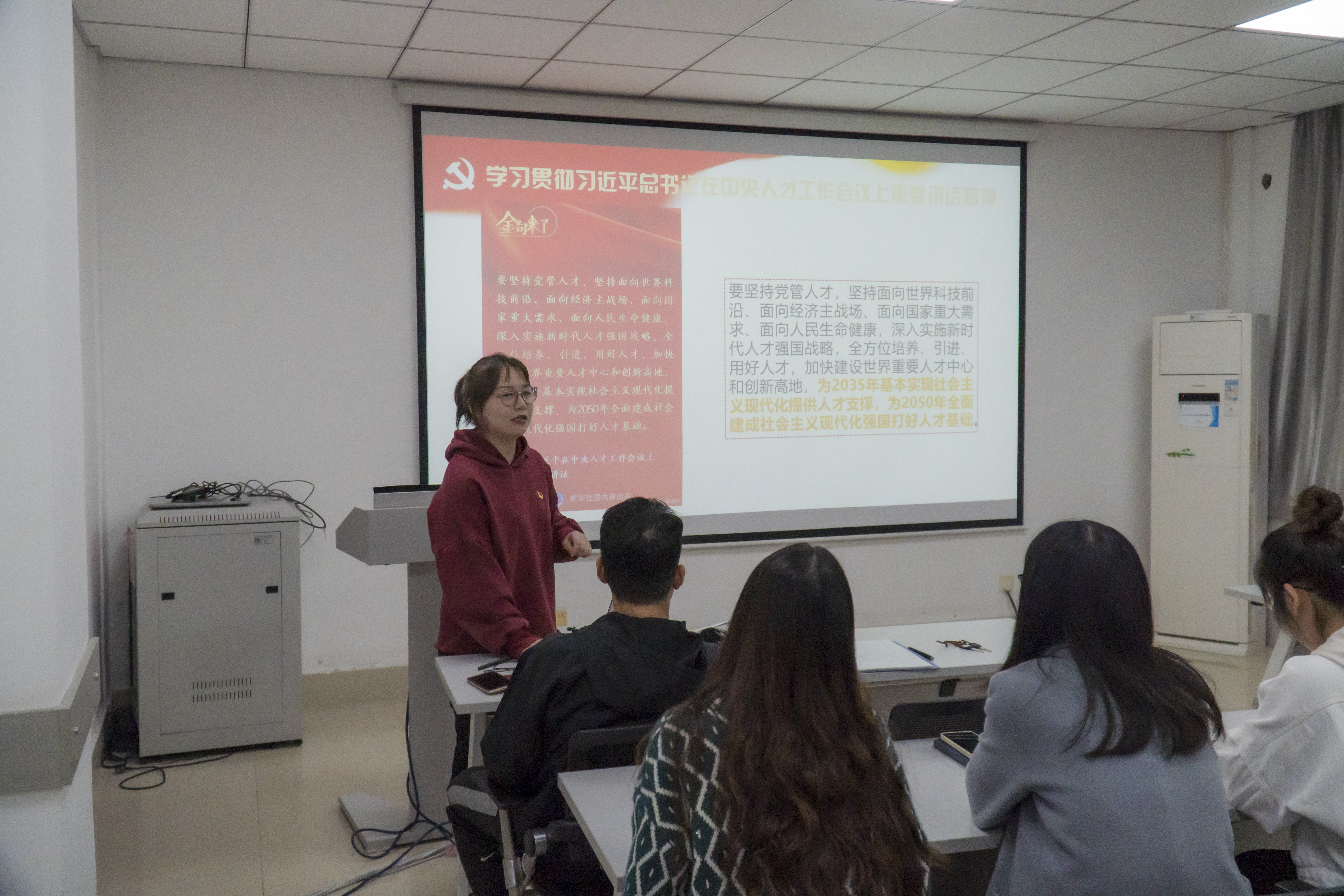 随后,金属材料第一研究生党支部组织委员常佳鑫带领支部成员学习了习近平总书记在中央人才工作会议上的重要讲话,并就重要讲话中“广大人才要继承和发扬老一辈科学家胸怀祖国、服务人民的优秀品质,心怀‘国之大者’,为国分忧,为国解难,为国尽责”一句进行展开学习。分别介绍和学习了我院老一辈科学家周尧和院士和傅恒志院士在科教事业上的杰出贡献和他们身上忠心赤诚、无私奉献、勇于担当的优秀品质。