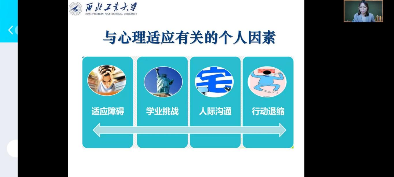 邀请学生心理健康中心卢天娇老师组织开展心理适应讲座,讲座经过直播录制后,于十月一日至十月十日期间,21级本科新生以小班为单位在线观看学习。卢天娇老师以新生入学阶段及随后大学几年的生活节奏调整与积极心态建立为题,进行了生动、翔实,且具有针对性开展了针对性的讲授。