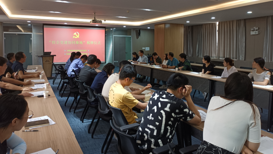 首先双方分别就支部党建基本情况,研究领域,团队科研工作进行了简要介绍,并对党建协同基地创建和人才培养等问题展开深入交流,讨论确定了后续联合开展相关党建和科研工作融合活动。在双方参会人员的见证下,双方负责人为“校企党建协同基地”揭牌。协同基地的成立为双方今后的校企合作、党建协作、科研攻关提供了平台支撑,有利于进一步落实产学研和科研学术攻关。