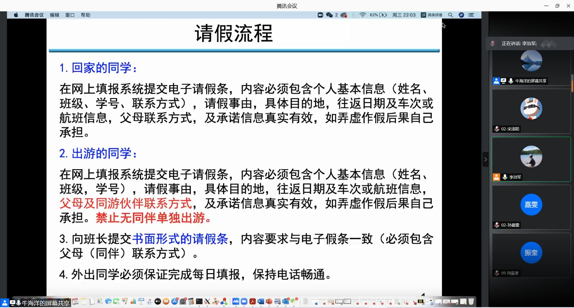 会议首先,李治军就清明节假期放假安排与外出请假有关要求为同学们进行了详细的介绍,并对安全出行有关要求进行了介绍,提醒同学们假期外出务必严格遵守学校疫情防控常态化有关要求,并务必注意个人安全,在做好疫情防控的基础上做好个人人身及财产安全保护。