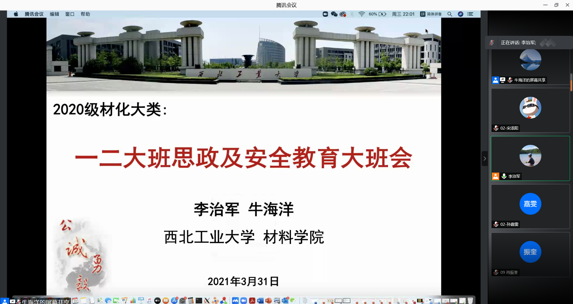 清明节前,为了提高同学们的安全意识,让大家度过一个更好的假期。2020级材料与化工大类3月31日晚召开思政及安全教育主题大班会。会议由辅导员李治军老师和牛海洋老师主持。