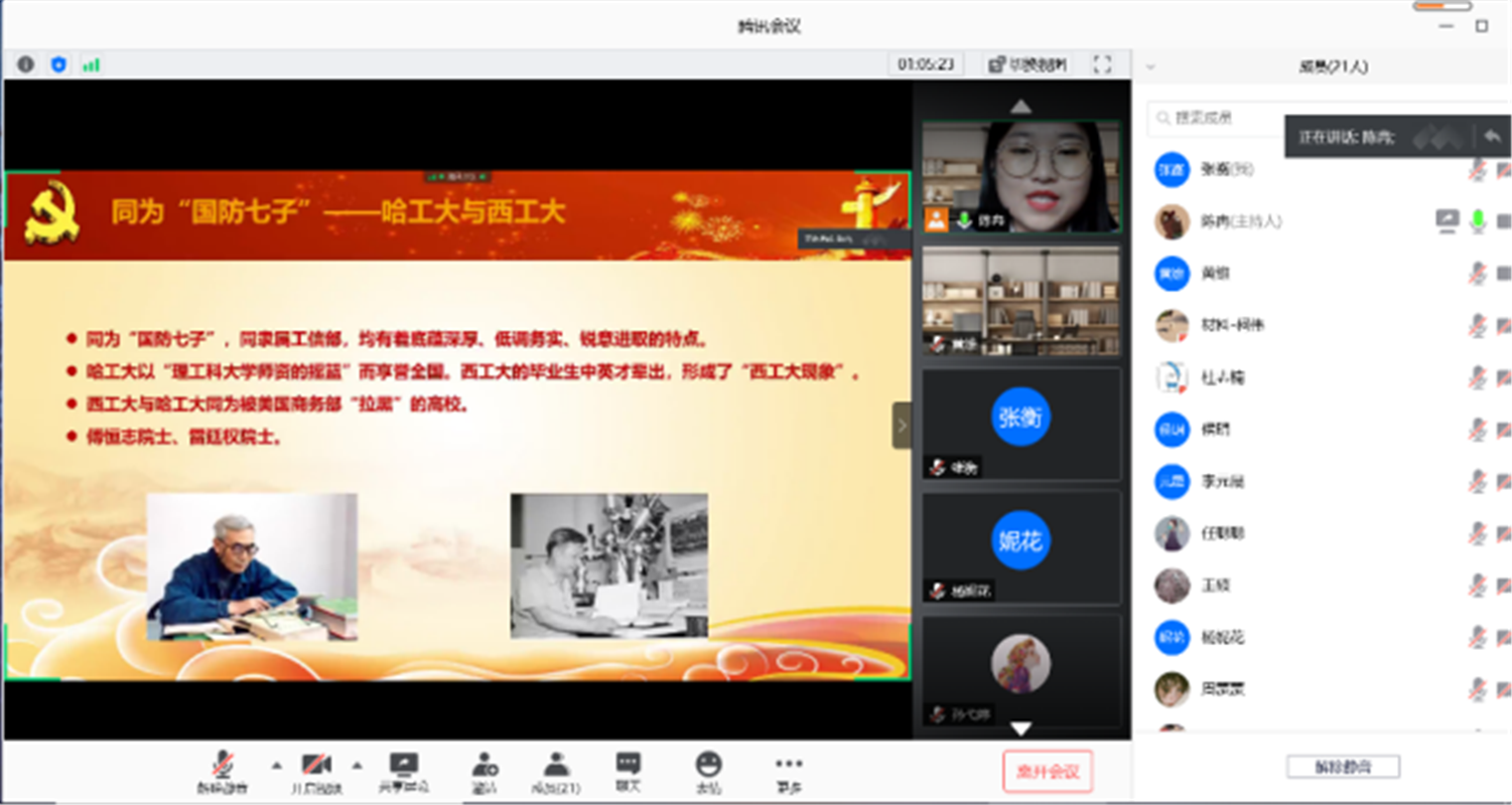 随后,陈冉同志从人才培养、科学研究等方面介绍了哈工大与西工大之间的交流合作,全体党员通过观看两所高校宣传片的形式对两所学校的历史底蕴发展和国防贡献进行了深入了解。