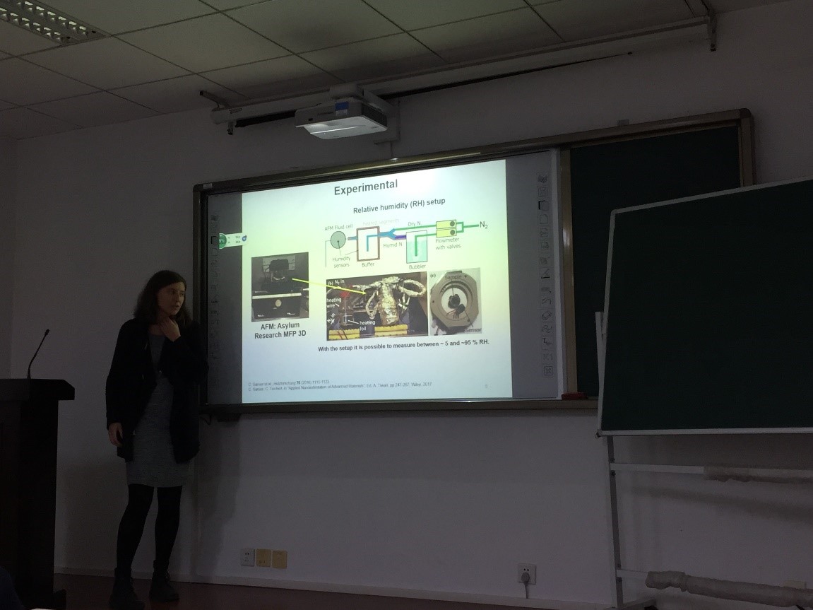 Caterina Czibula助理研究员主要介绍了原子力显微镜对赛璐璐等纸张纤维等力学性能的表征。纸张纤维,尤其是特殊用途纸张,在不同环境湿度特别是特殊环境下的力学性能对于纸张等的使用十分重要,目前的研究主要处于对纤维之间结合力的表征,而对于极纤细纤维(直径约60μm)的自身的力学性能表征目前处于研究空白。Caterina Czibula助理研究员和莱奥本大学物理系Christian Teichert教授合作,开创性地使用原子力显微镜对纤维自身力学性能进行表征,并提出了纤维在不同湿度环境下显微力学性能的理论模型,该模型对于其他纤维力学性能同样有很强的借鉴意义。