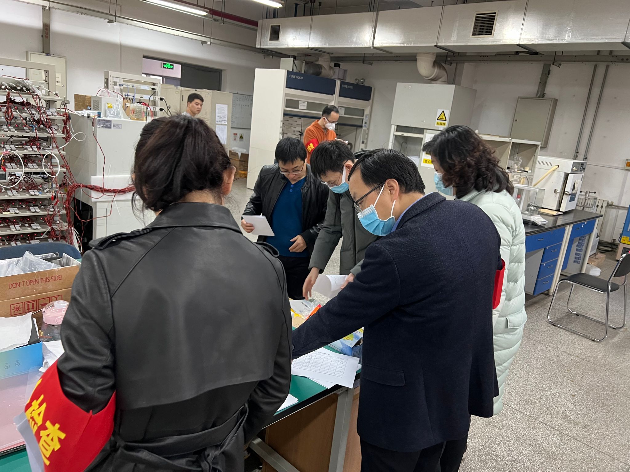 学院同时邀请了科学技术研究院缑林峰副院长等一行莅临现场指导工作,重点对学院安全生产管理制度、危化学品管理、应急预警、消防设施等情况进行现场督查和指导,提供了许多宝贵的意见和建议。根据《高等学校实验室安全检查项目表(2022年)》,结合学院实际,学院科研办制定了安全教育培训、消防设施维护、原有化学品库存盘点、药品试剂标签规范、管制类化学品存放、化学品存储与出入库、气瓶使用和危废管理等八个方面共三十二条安全标准。检查组成员根据制定的安全标准一一对标对表检查,重点对实验室危化品管理、易燃易爆气体检测、气瓶使用、消防、电路、危废处置等进行了全面细致的检查,对发现的问题与实验室安全负责人进行了及时沟通交流,提出了具体整改建议,并下发整改通知书,要求限时完成整改。