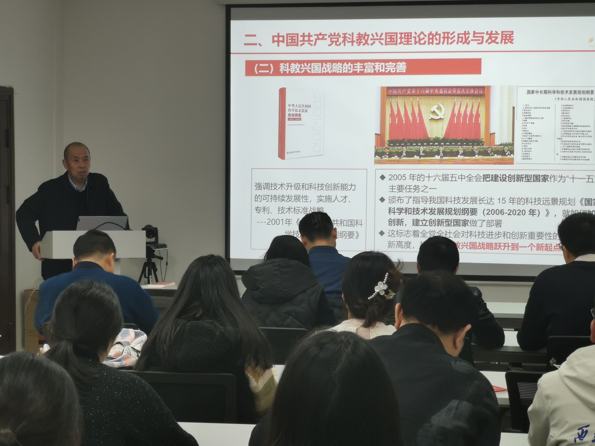 李金山以“科教兴国战略的历史成因与实践创新”为主题,围绕党的二十大精神,从科教兴国思想产生的历史背景出发,介绍了科教兴国理论的形成与发展,讲述了科教兴国理论的重要论述以及我国在科教兴国理论的指导下做出的实践创新,提出了西工大材料人科技报国的责任担当。李金山强调,要正确理解和认识教育、科技、人才是全面建设社会主义现代化国家的基础性、战略性支撑的重要地位,全面贯彻党的教育方针,落实立德树人根本任务,培养德智体美劳全面发展的社会主义建设者和接班人;要以国家战略需求为导向,集聚力量进行原创性引领性科技攻关,坚决打赢关键核心技术攻坚战;要坚持党管人才原则,加快建设世界人才中心和创新高地,要加强人才国际交流,用好用活各类人才。