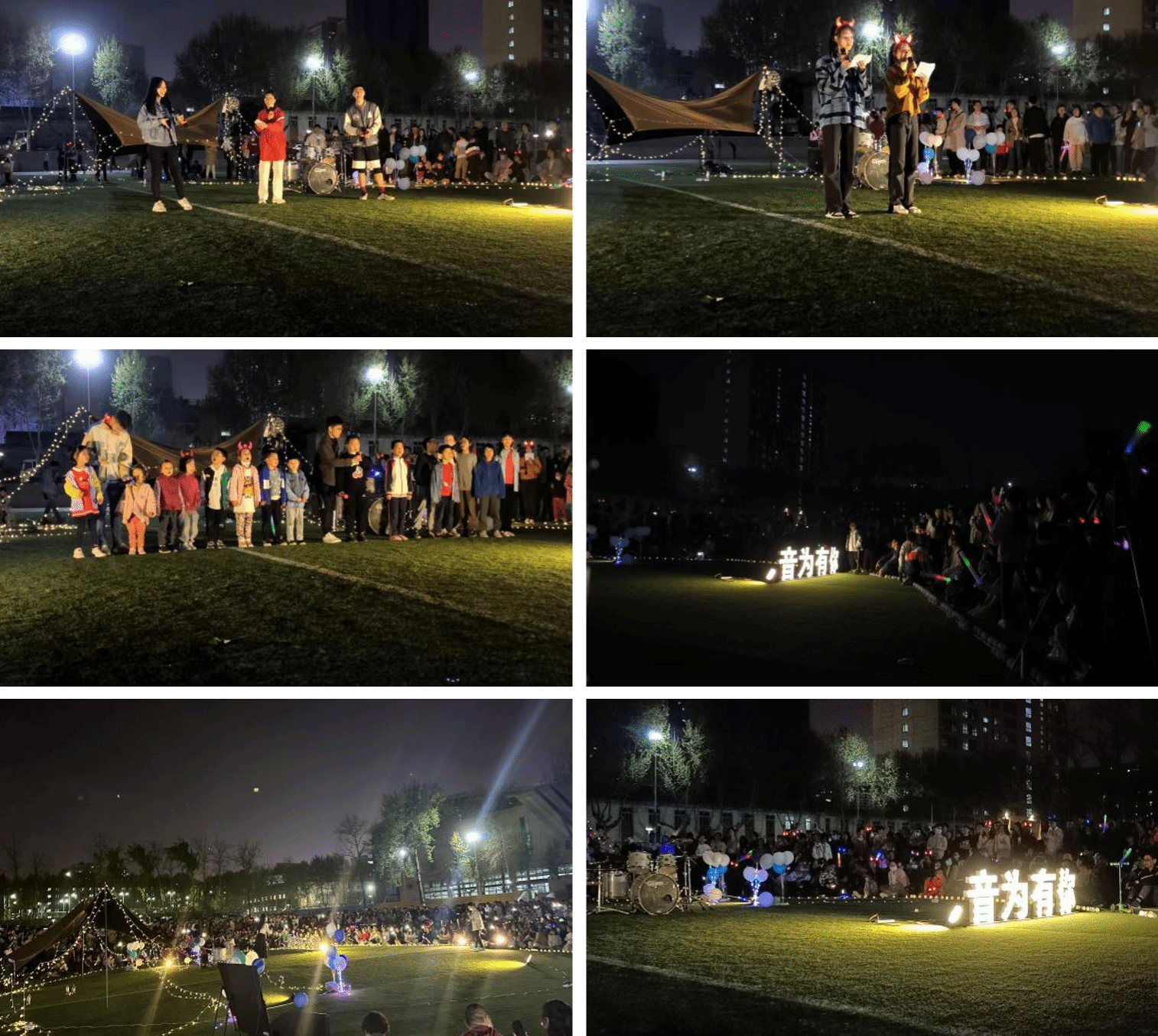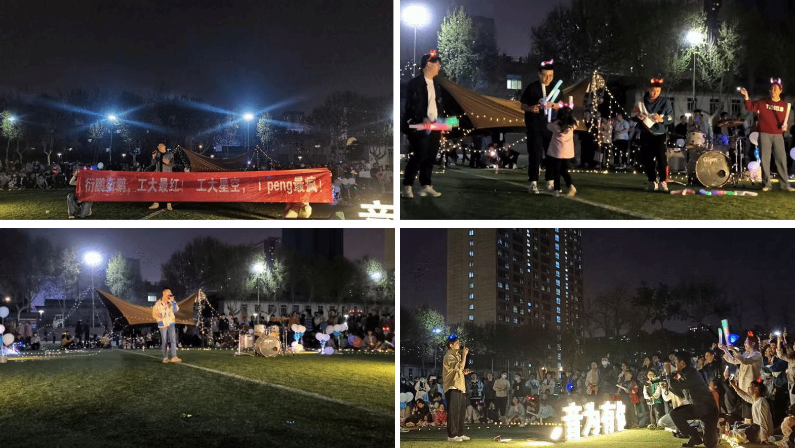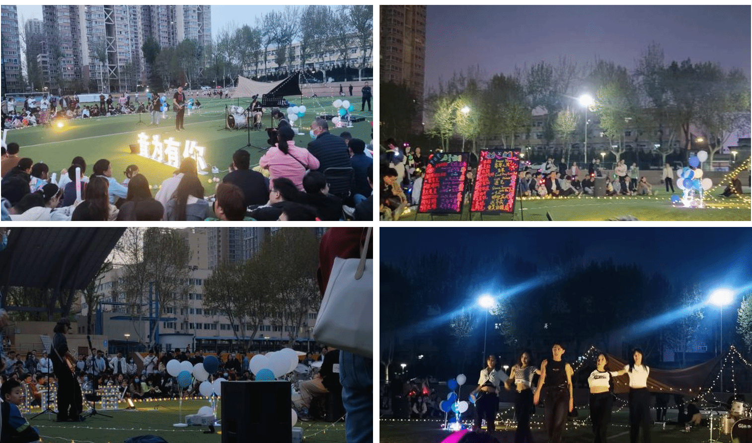 友谊校区塑胶田径场拉开帷幕。草坪、气球、彩灯、荧光棒、乐器为音乐会带来了活泼多彩的颜色,温情在午后传递,旋律在黑夜起舞,我们尽情欢唱,歌唱青春,歌唱未来。