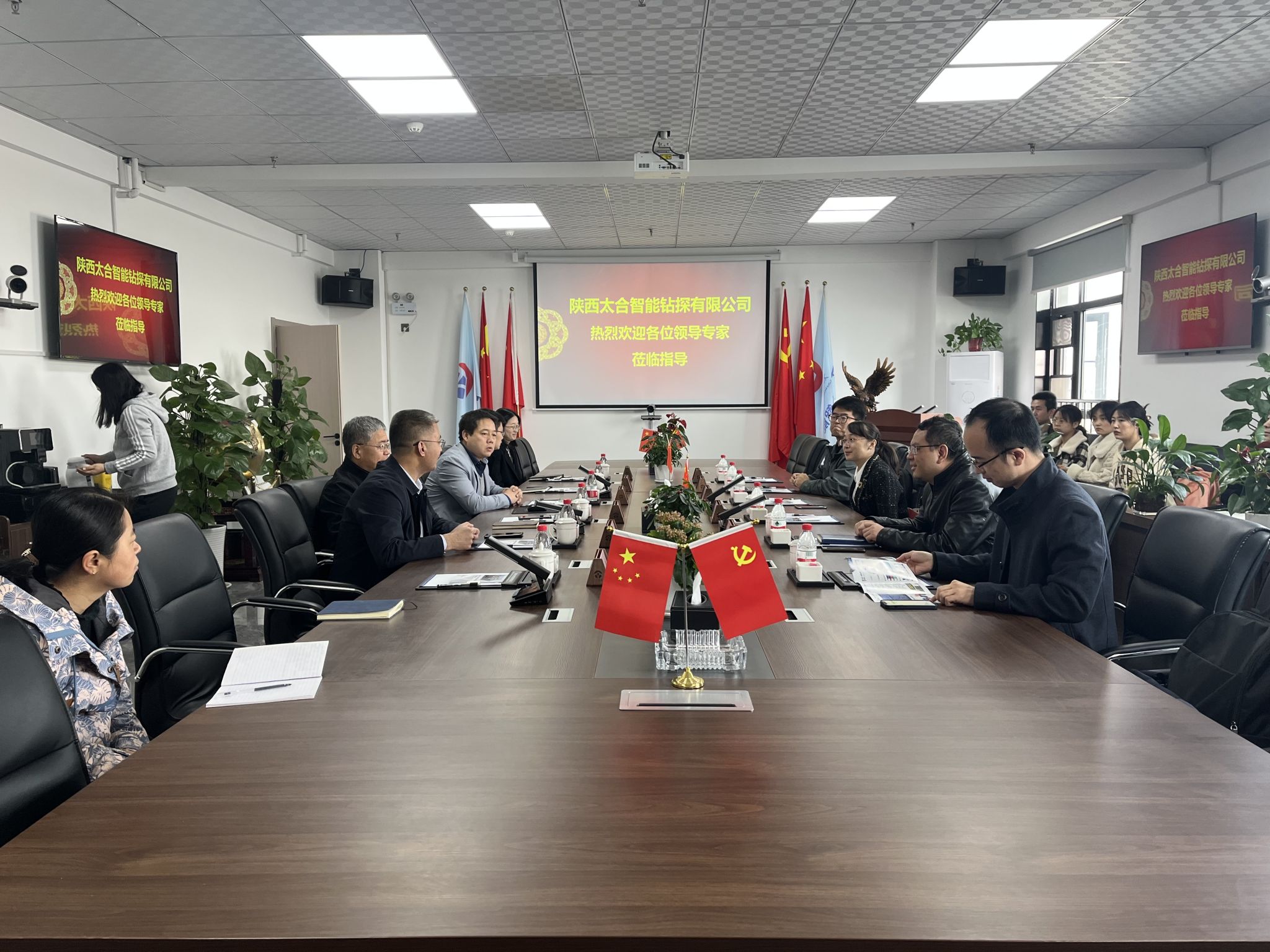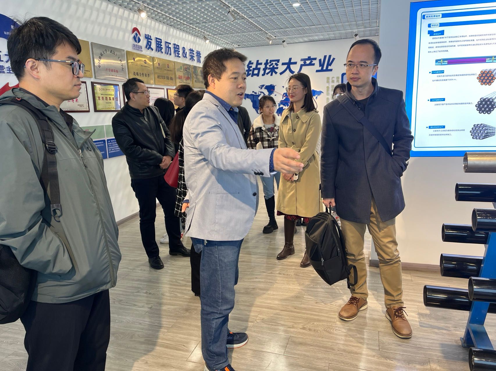 一行在副总工程师曹海涛的带领下参观了陕西太合智能钻探有限公司的生产加工车间,并就钻机研发关键技术、钻头设计研制及钻杆生产线优化等技术进行了充分交流。双方均表示希望发挥各自优势,在人才培养、技术攻关、成果转化等方面推进全面合作,努力实现产学研双赢的目标。
