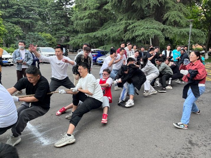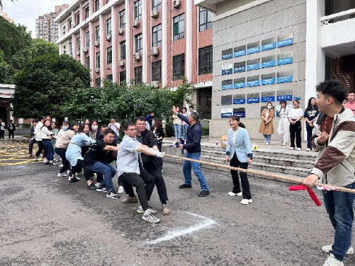 开幕式结束后,拔河比赛正式开赛。教师代表队等8支党支部参赛队伍采取现场抽签分组的方式,分为4组进行首轮晋级赛。随着一声哨响,在震耳欲聋的呐喊助威声中比赛开始,双方队伍降低重心、紧握绳子,以“一二一二”的节奏奋发用力。队伍成员齐心协力,裁判员公平负责认真,拔河比赛顺利进行。