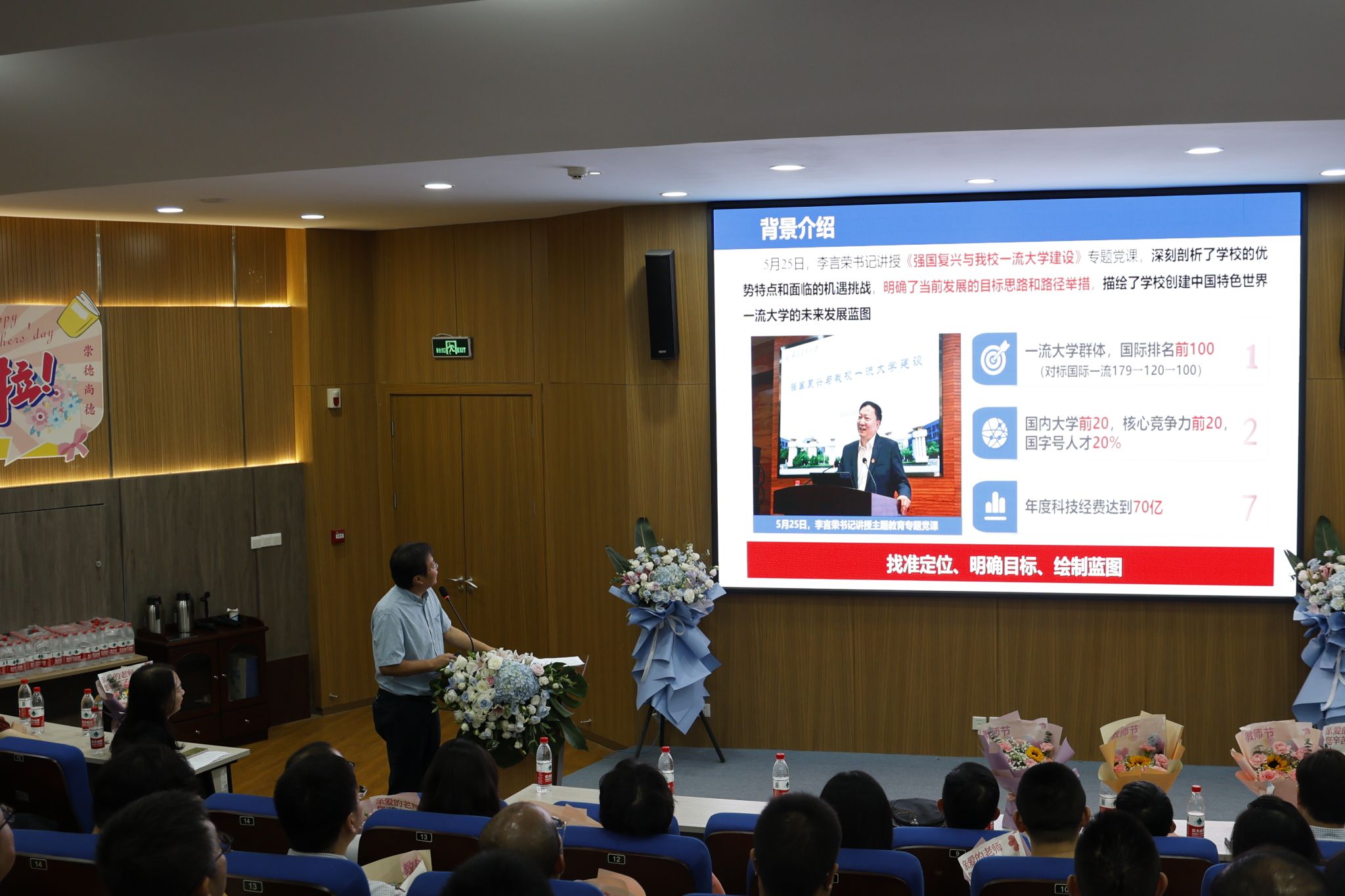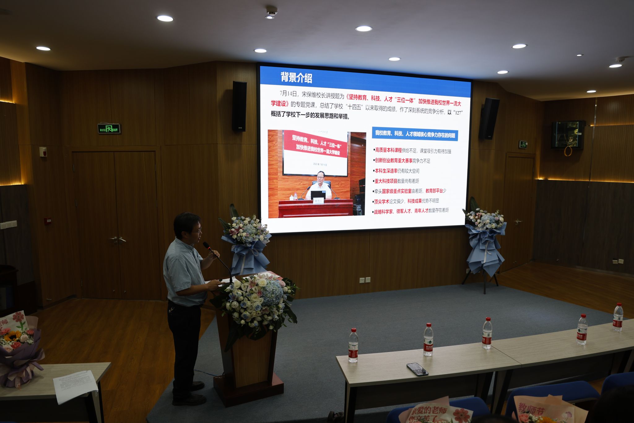李恒传达了李言荣书记和宋保维校长专题党课及2023年暑期工作研讨会暨新学期干部大会精神,重点解读了李言荣书记提出的“127”发展任务目标和宋保维校长提出的“127”发展总体思路与具体落实举措,传达了学校在推进机构改革和评价改革、提升人才培养质量和科学研究水平、壮大人才队伍、拓展开放办学等五个方面的工作部署,并结合学院发展的实际带领与会师生学习领会了李言荣书记关于克服“两瓶颈、一氛围”等难点堵点问题的相关工作要求。