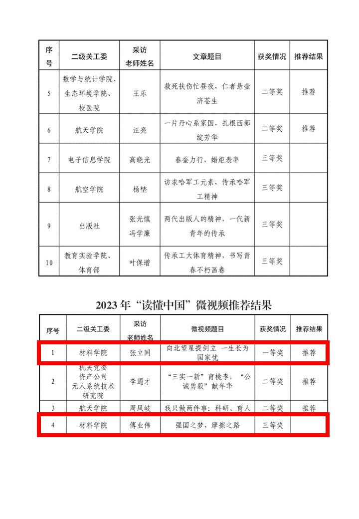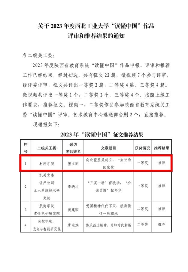 “读懂中国”作品评审和推荐结果的通知》,我院报送的征文作品《向北望星提剑立,一生长为国家忧》获征文类一等奖,微视频作品《向北望星提剑立,一生长为国家忧》、《强国之梦,摩擦之路》分别获微视频类一等奖、三等奖,其中一等奖作品将推荐参加陕西省教育系统关工委“读懂中国”评审。