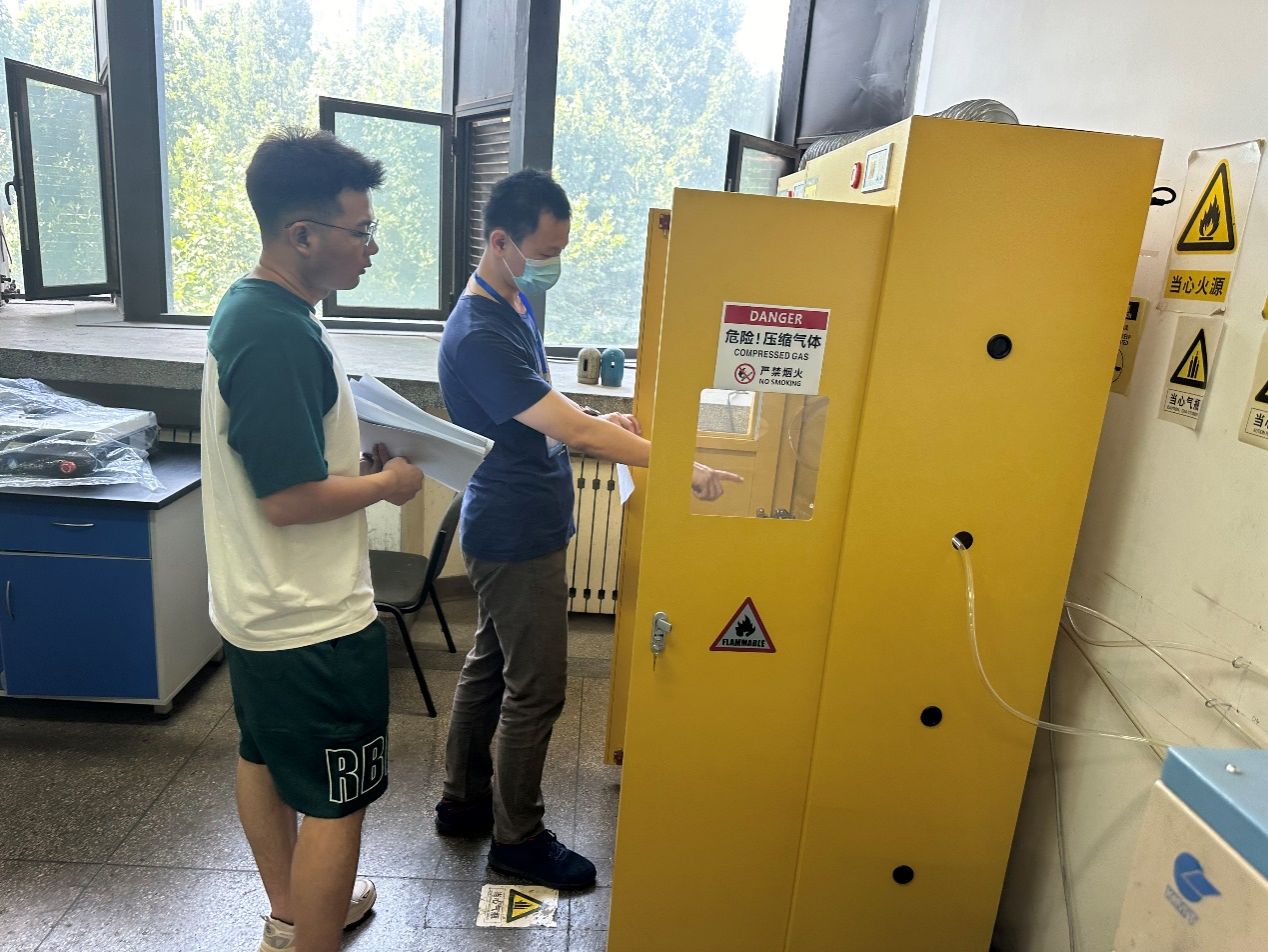 检查组按照《高等学校实验室安全检查项目表(2024年)》要求,对实验室危险化学品、气体、高风险设备使用安全等进行了重点检查。对检查中发现的风险隐患进行了现场记录,并与实验室安全员沟通,提出整改意见,明确整改期限。