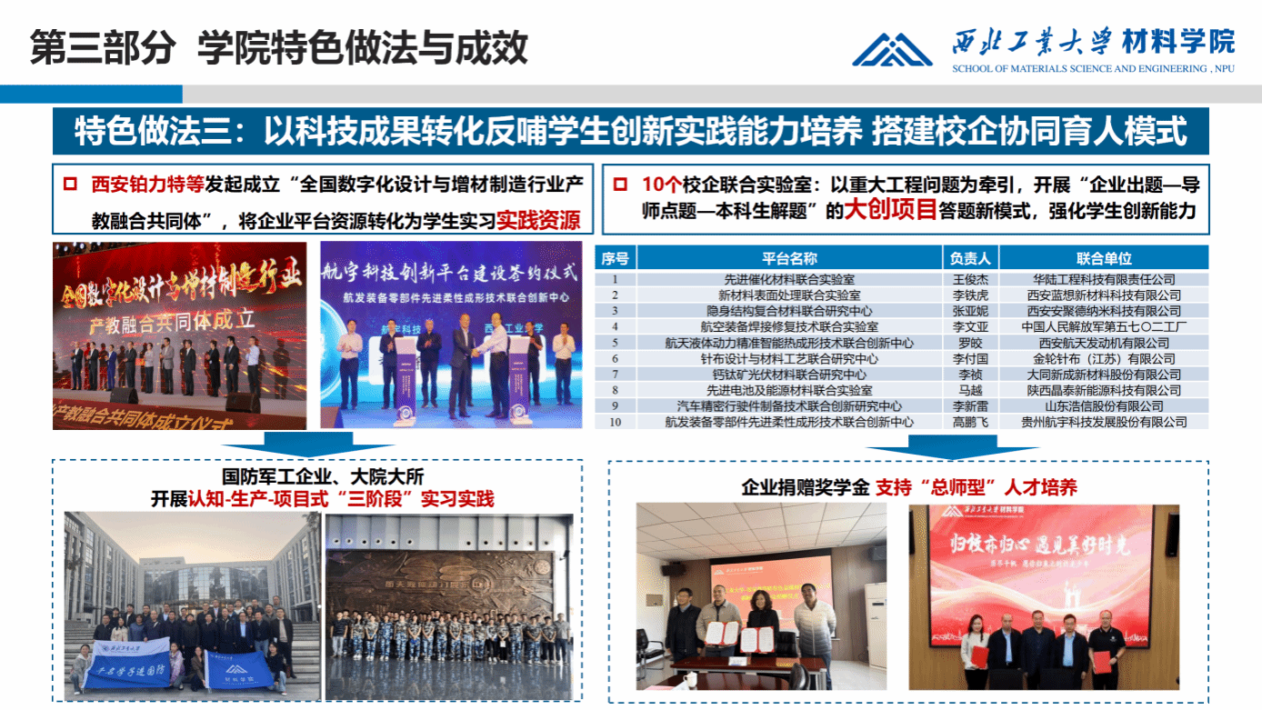学院探索出一条独具特色的产学研用发展模式,科技成果转化支撑创建了陕西华秦、西安铂力特、鑫垚、超晶、迪泰克、重庆两航等十余个高科技创新企业。积极推动产教融合共建高水平教学平台,西安铂力特等发起并联合百余家学校、科研机构、行业企业等组建成立“全国数字化设计与增材制造行业产教融合共同体”;获批工信部“天使动漫