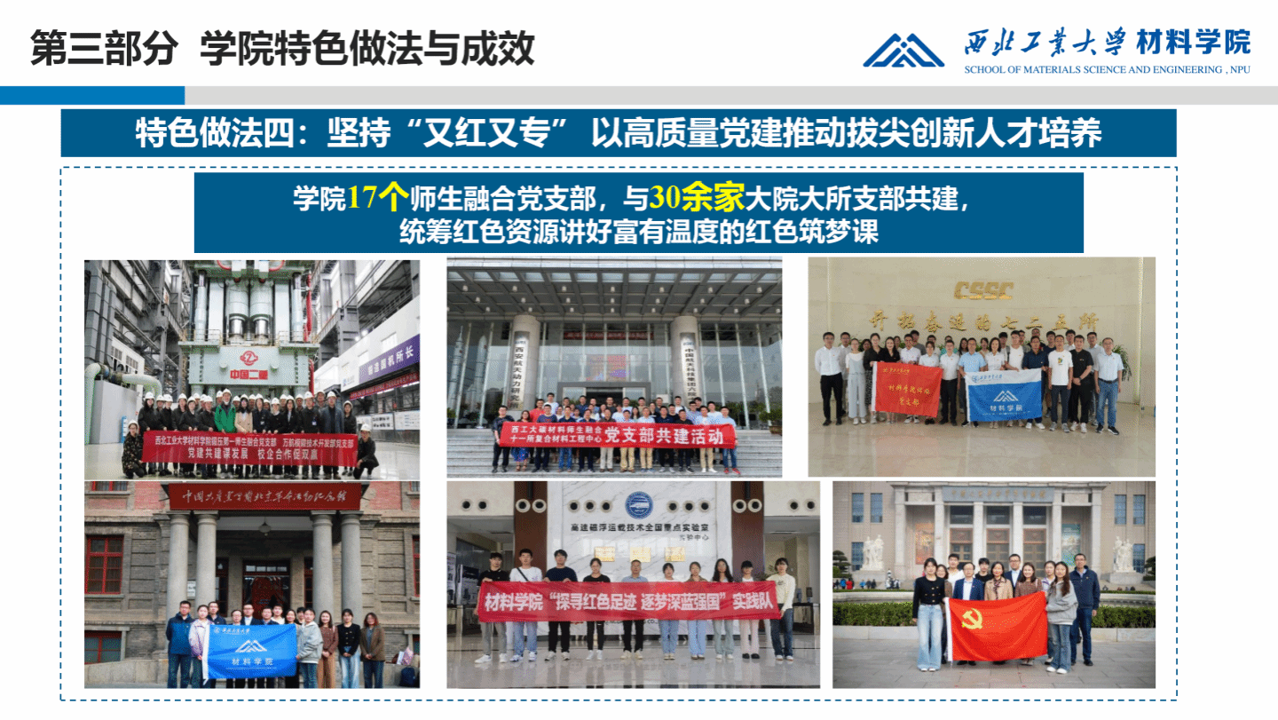 坚持把党旗插在人才培养第一线,发挥好师生融合党支部与大院大所共建、CJ校企联聘、行业讲座教授等作用,促进党建工作与教育教学工作双促进、双提高。学院与中国航空制造技术研究院、中国航空工业集团公司北京航空材料研究院、中国航天科技六院十一所等30家院所、企业等开展校企支部共建,开展认知-生产-项目式“三阶段”实习,使学生身临其境感受科研成果助力大国重器研制和社会经济发展,培养学生投身军工事业的家国情怀。将实践育人、服务育人与组织育人有机结合,融入人才培养全过程,依托延安、照金等丰富红色资源,开展“走初心之路,点亮红色中国”实践教学,打造爱国主义实践“金课”;开展同心抗疫、爱心支教、乡村振兴等特色活动,打造志愿服务和社会责任实践“金课”,提升群团工作成效。坚持党建带团建,引领广大青年高举团旗跟党走,青春建功新时代。近3年,学院人才培养质量持续提升,本科生深造率达到77%,学生良好学风态势逐步形成,稀有金属材料与加工团队获校“三全育人”先进集体,获校级科研育人示范团队2个。学院团委入选首批陕西省高校团建标杆院系,“摆渡者青年志愿者服务队”入选“榜样100”全国最佳大学生社团。