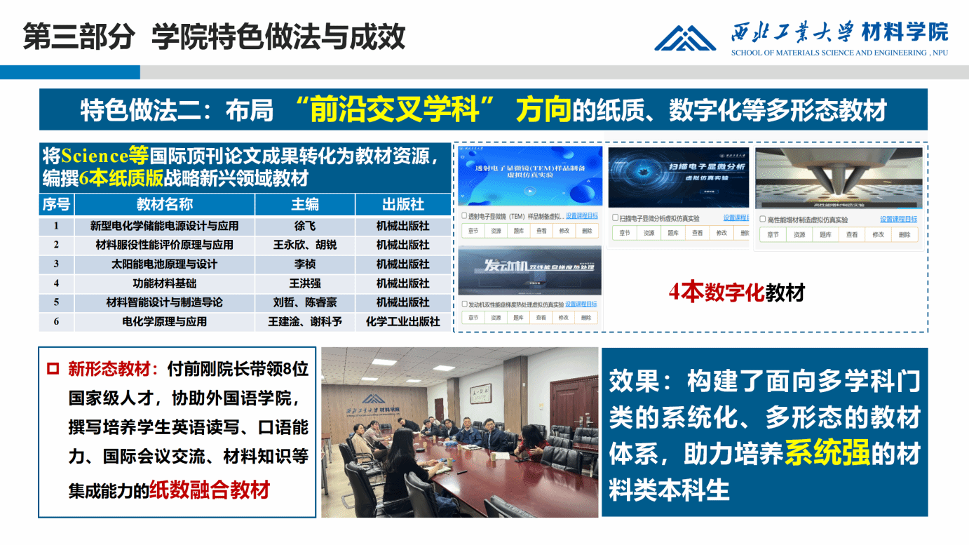 学院坚持“科教融合、学术育人”理念,以一流的科研成果支撑分层级、系列化、成套化、多形态本科教材建设。围绕传统特色“优势学科”,将24项国家高水平成果转化为教材内容,编撰了15本系列化教材。围绕“纳米能源”等前沿学科方向,推进Science、Nature Energy等国际高水平期刊论文成果向高质量教材转化,编撰了《功能材料基础》《材料智能设计与制造导论》《新型电化学储能电源设计与应用》等6本战略性新兴领域教材。推进高水平科研成果向高质量教材转化,让科教融合进入本科生课堂。