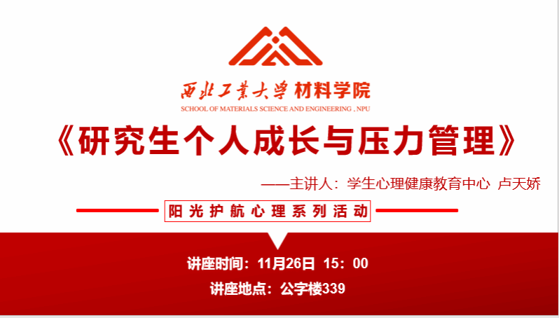 举办以《研究生个人成长与压力管理》为主题的阳光护航心理健康教育专题讲座,同时对学院心理委员进行培训。此次活动邀请了校学生心理健康教育中心卢天娇老师担任主讲,学院研究生各班心理委员及部分同学参与讲座。讲座由学工主管冯婷婷主持。