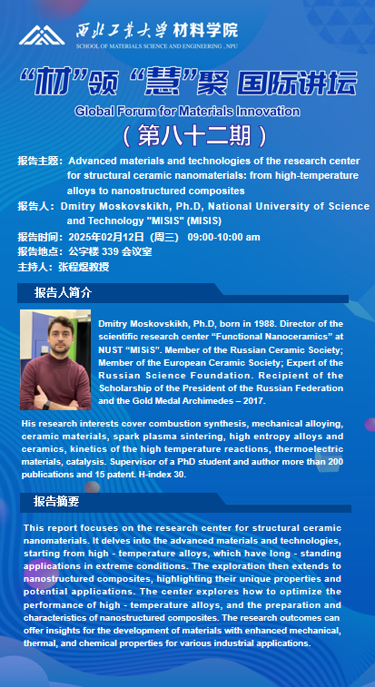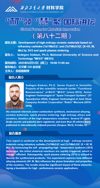 国际讲坛:1、Advanced materials and technologies of the research center for structural ceramic nanomaterials: from high-temperature alloys to nanostructured composites 2、Development of high-entropy ceramic materials based on refractory carbides (TaTiNbZr)C and